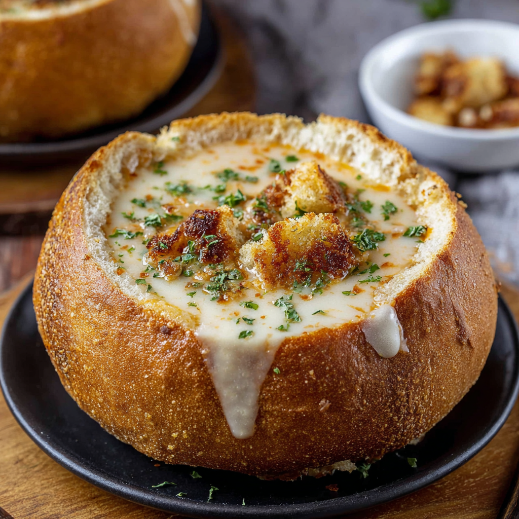 Pour hot soup into toasted bread bowls. Top with Parmesan, parsley, or bacon bits. Serve immediately while the bread is still crisp and the soup is steaming.