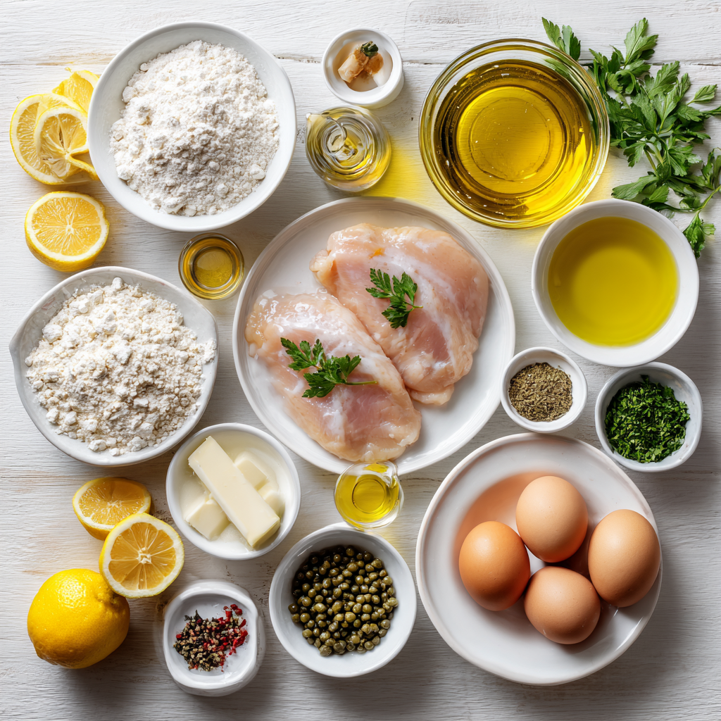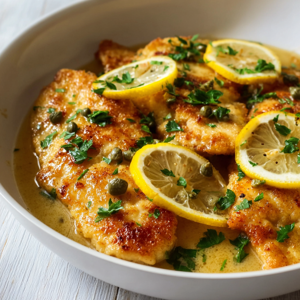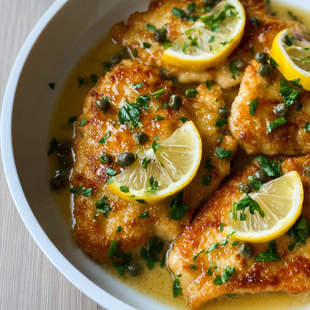 Summary: Thin chicken cutlets dredged in flour and egg, pan-fried until golden, and simmered in a lemon-butter and white wine sauce.