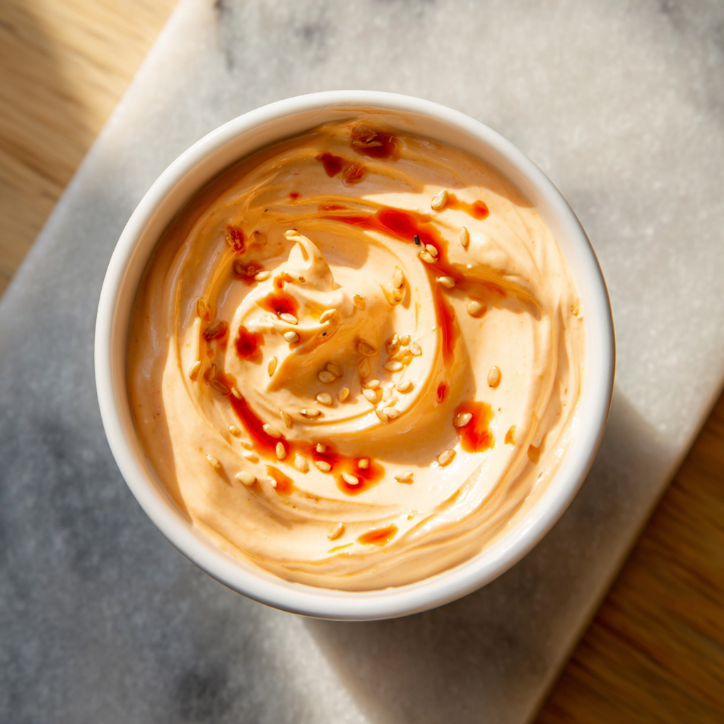 Summary: A creamy, spicy emulsion of Japanese Kewpie mayonnaise, Sriracha, and toasted sesame oil.
