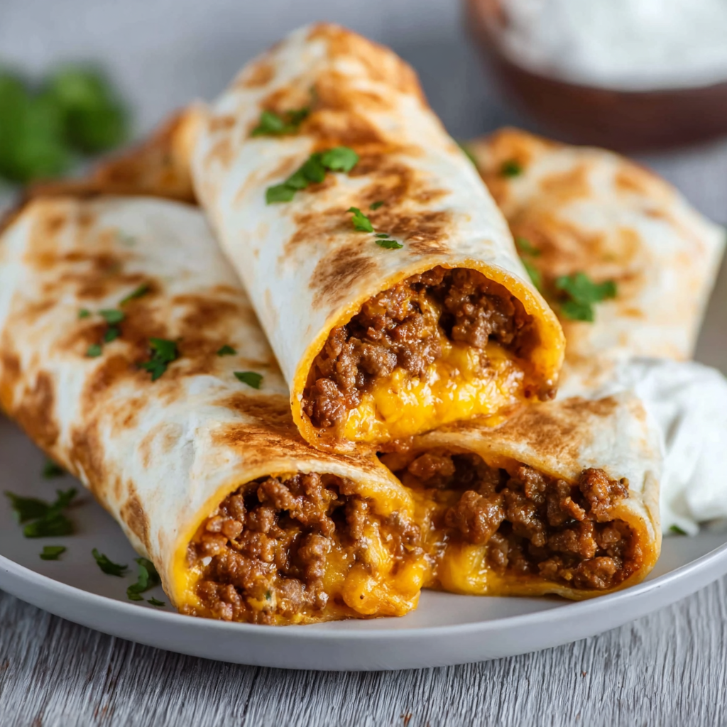 Summary: Seasoned ground beef and refried beans wrapped in a flour tortilla with cheddar cheese, then pan-seared until crispy. Freezer-friendly.