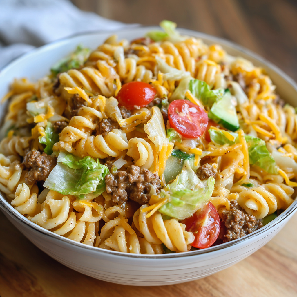 This bold and creamy Big Mac Pasta Salad combines seasoned ground beef, tender pasta, crisp lettuce, cheddar cheese, tangy pickles, and a homemade “special sauce” dressing that tastes just like your favorite fast-food burger—without the drive-thru. It’s hearty, nostalgic, and perfect for potlucks, BBQs, and meal prep.