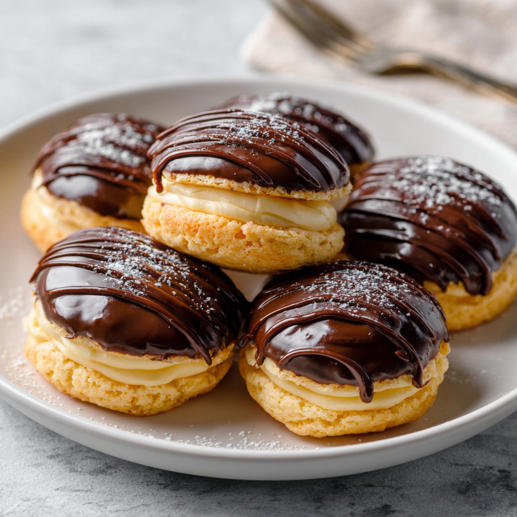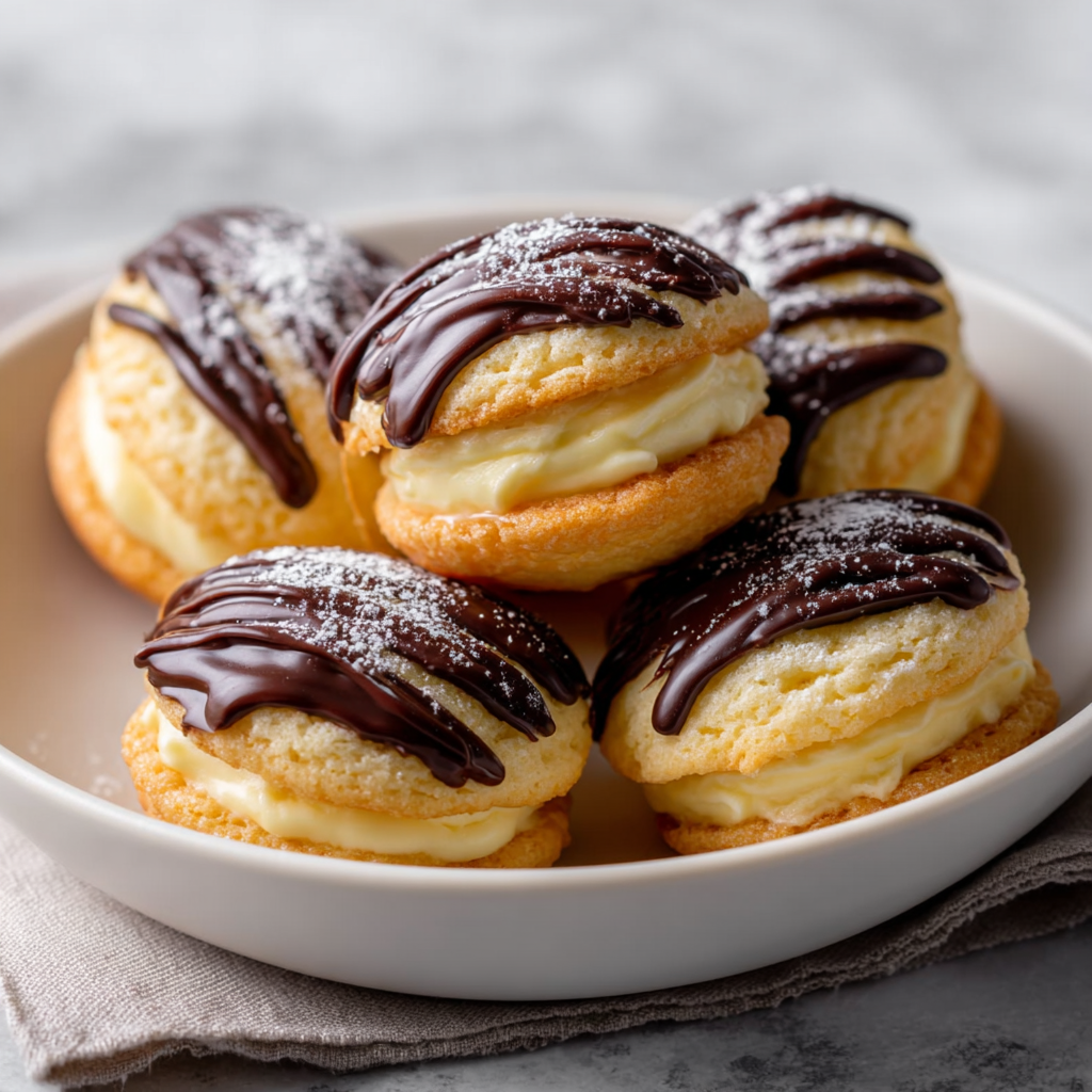 These are essentially Vanilla Whoopie Pies. We bake soft, cake-like vanilla cookies, sandwich them around a thick, velvety custard, and dip the top shell in a silky chocolate glaze.3 They are messy, indulgent, and arguably better than the cake because the ratio of chocolate-to-cream-to-sponge is perfect in every single bite.