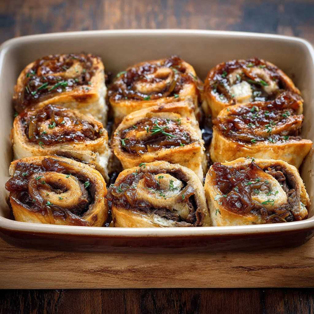 These rolls combine tender roast beef, deeply caramelized onions, and melty cheese wrapped in soft bread or pastry, then baked until golden and irresistible. Perfect for parties, quick dinners, or game-day snacks, this recipe is all about bold flavor with minimal effort.