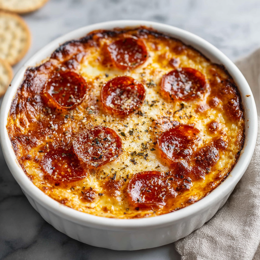 Summary: A layered hot dip featuring a seasoned cream cheese base, marinara sauce, melted mozzarella, and crispy pepperoni. Keto-friendly.