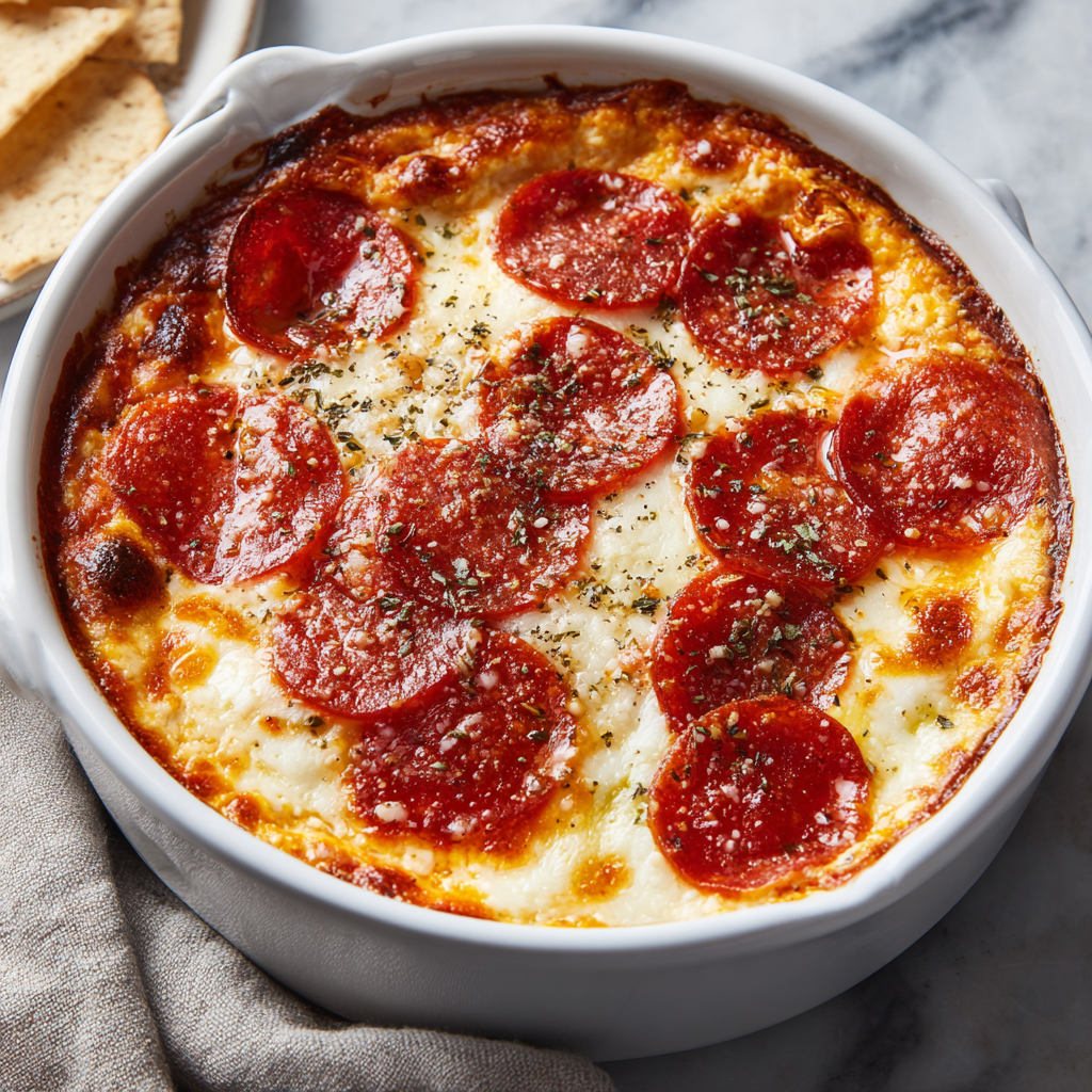 Pepperoni Pizza Dip is the ultimate party hack. It delivers all the satisfaction of a pizza delivery without the wait or the doughy heaviness. It is savory, cheesy, and interactive—exactly what you want on the table when the big game is on.