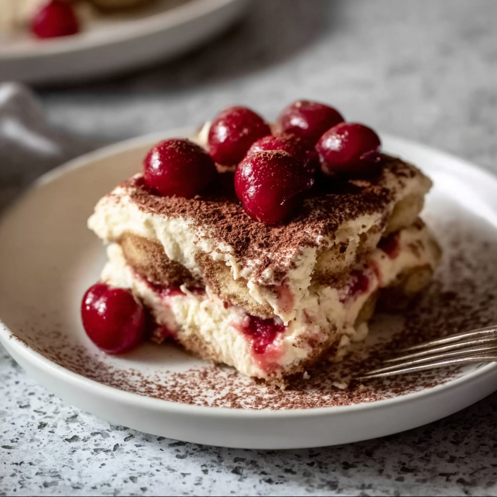 It is a sophisticated dessert that bridges the gap between a Black Forest Cake and a traditional Tiramisu. The ladyfingers soak up a blend of espresso and almond liqueur, creating a boozy, cake-like texture that pairs perfectly with layers of velvety mascarpone and juicy cherry compote. It is elegant, no-bake, and looks stunning in a glass trifle dish.