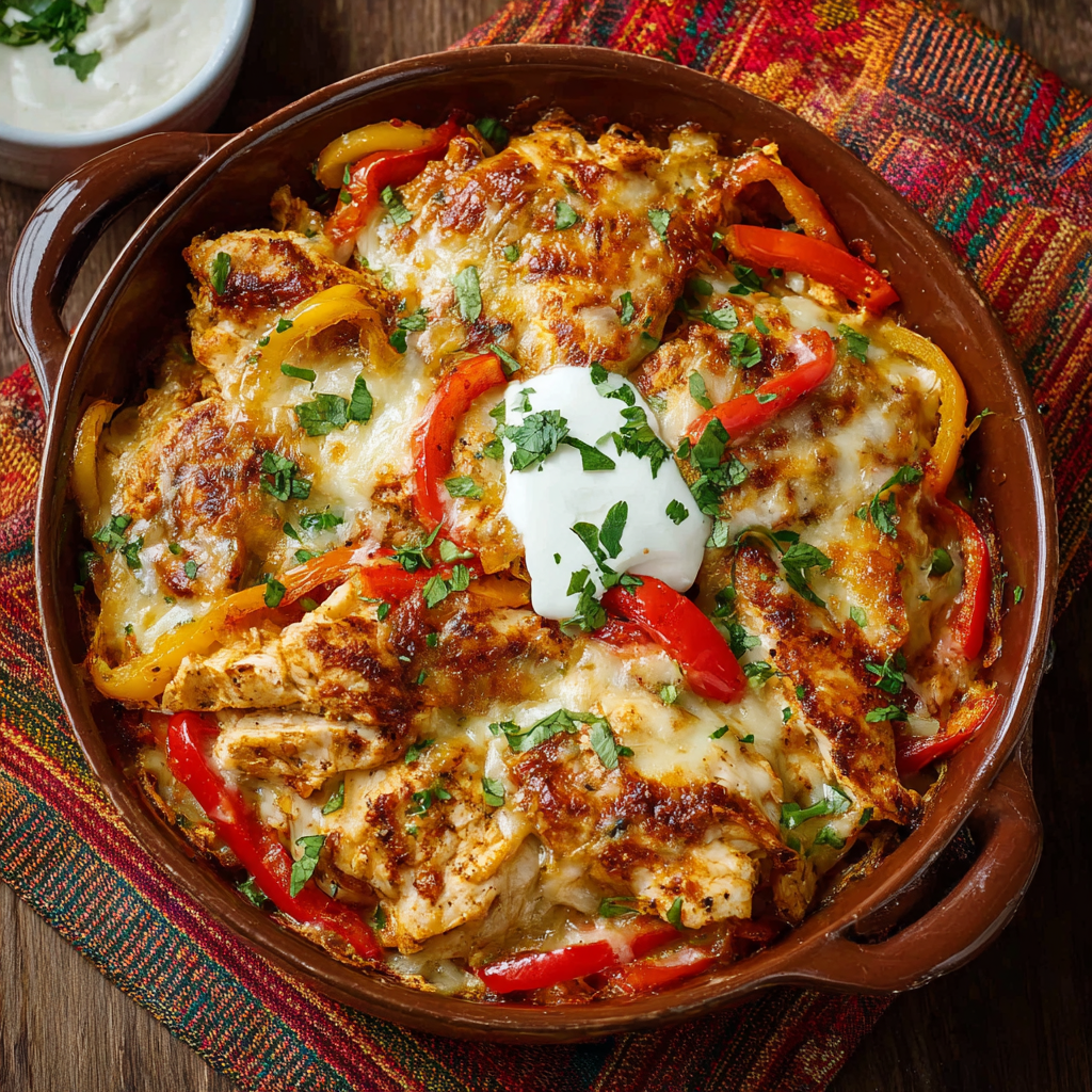 This dish transforms classic fajita ingredients—tender chicken, colorful peppers, and onions—into a rich, oven-baked meal topped with golden melted cheese. It’s a perfect example of how simple ingredients can create a restaurant-quality dish at home while saving time and effort.