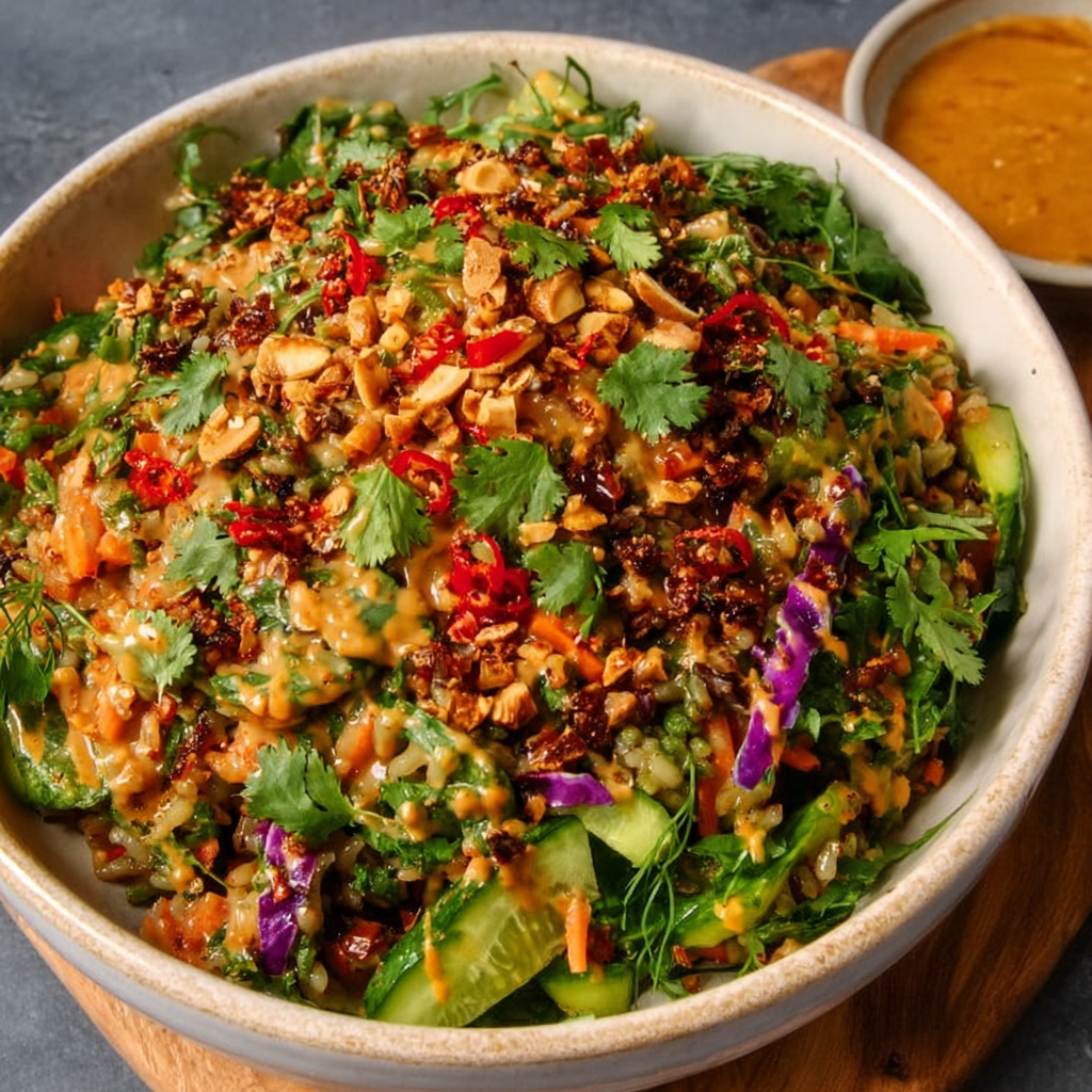 Compared to traditional grain bowls that require multiple cooked components, this Crispy Rice Salad with Peanut-Chili Dressing (Vegan + High-Protein) streamlines prep by crisping rice in one pan.