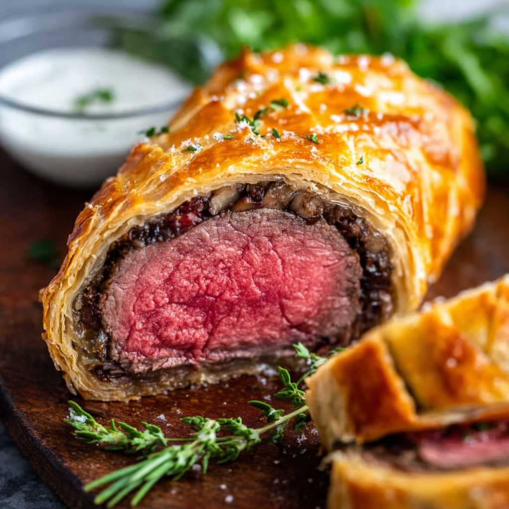 • Plating: Cut the Wellington in half at a slight angle to show off the perfect pink center and the distinct layers.