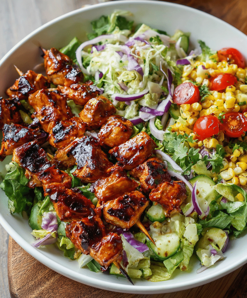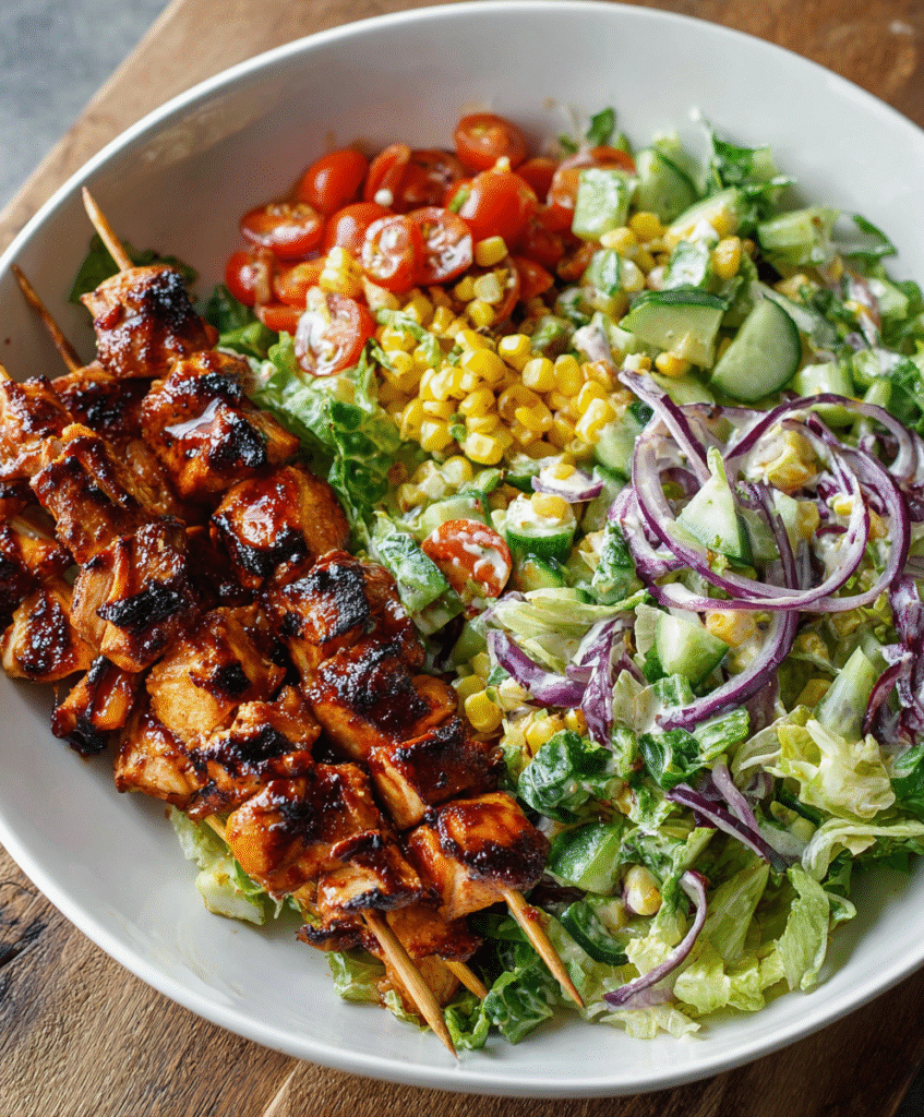 This Grilled BBQ Chicken Skewer Salad takes the iconic elements of the California Pizza Kitchen (CPK) favorite—crisp jicama, sweet corn, black beans, and hickory BBQ sauce—and reimagines them for the grill. By threading the chicken onto skewers, we increase the surface area for char and caramelization, adding a smoky depth that pan-searing simply cannot achieve. In this guide, we will cover the secret to the perfect BBQ ranch dressing, why jicama is the unsung hero of crunch, and how to grill chicken breast cubes without drying them out.