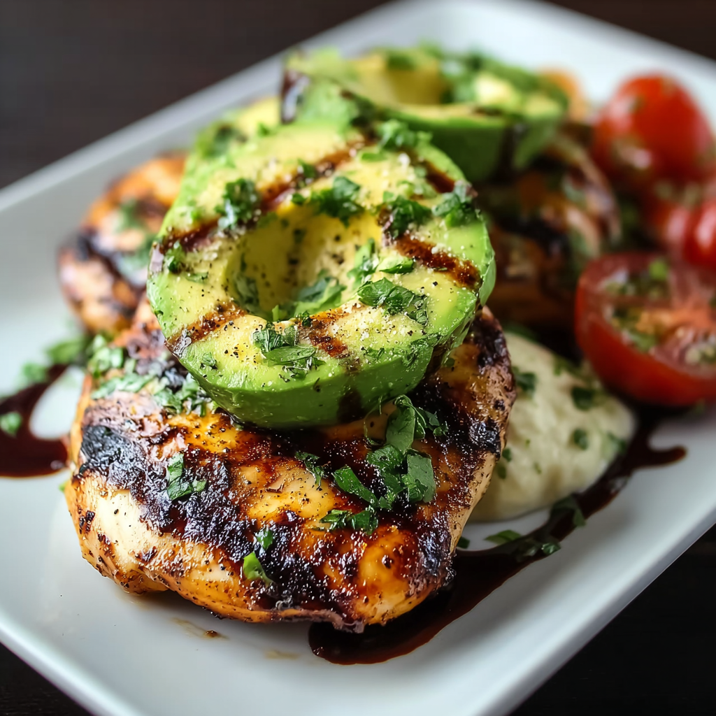 NLP Keywords naturally integrated: grilled avocado chicken, healthy chicken recipes, California-style chicken, avocado chicken recipe, grilled chicken dinner, fresh avocado topping, quick healthy meals.