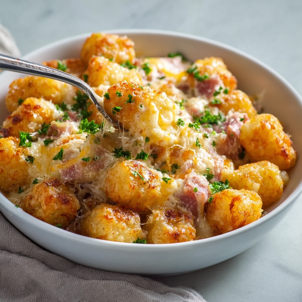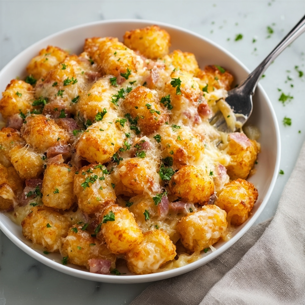 Ham and Tater Tot Casserole is the unsung hero of post-holiday cooking. It transforms “leftovers” into something that feels like a deliberate, delicious treat. It’s salty, creamy, cheesy, and crunchy—hitting every comfort food note in a single forkful.