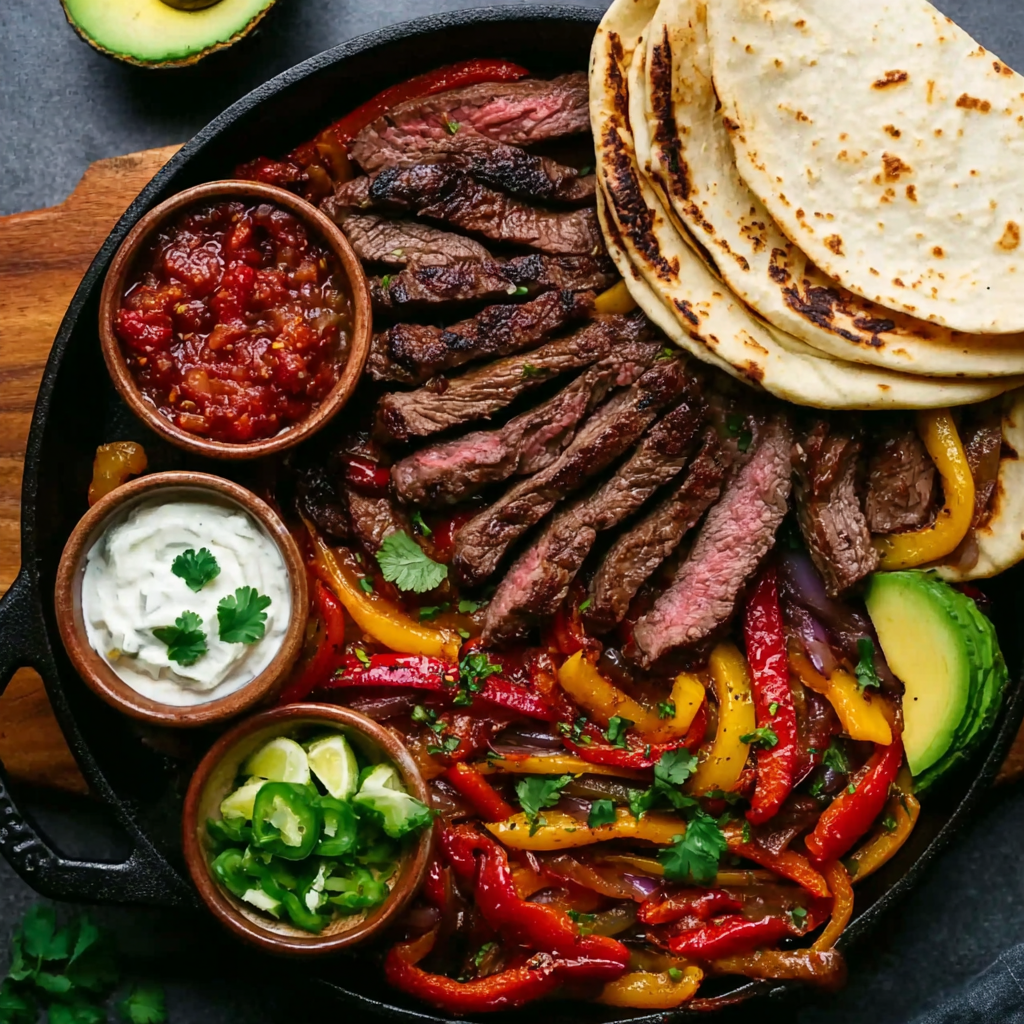These ingredients yield juicy, flavorful steak fajitas with tender vegetables and fresh toppings.
