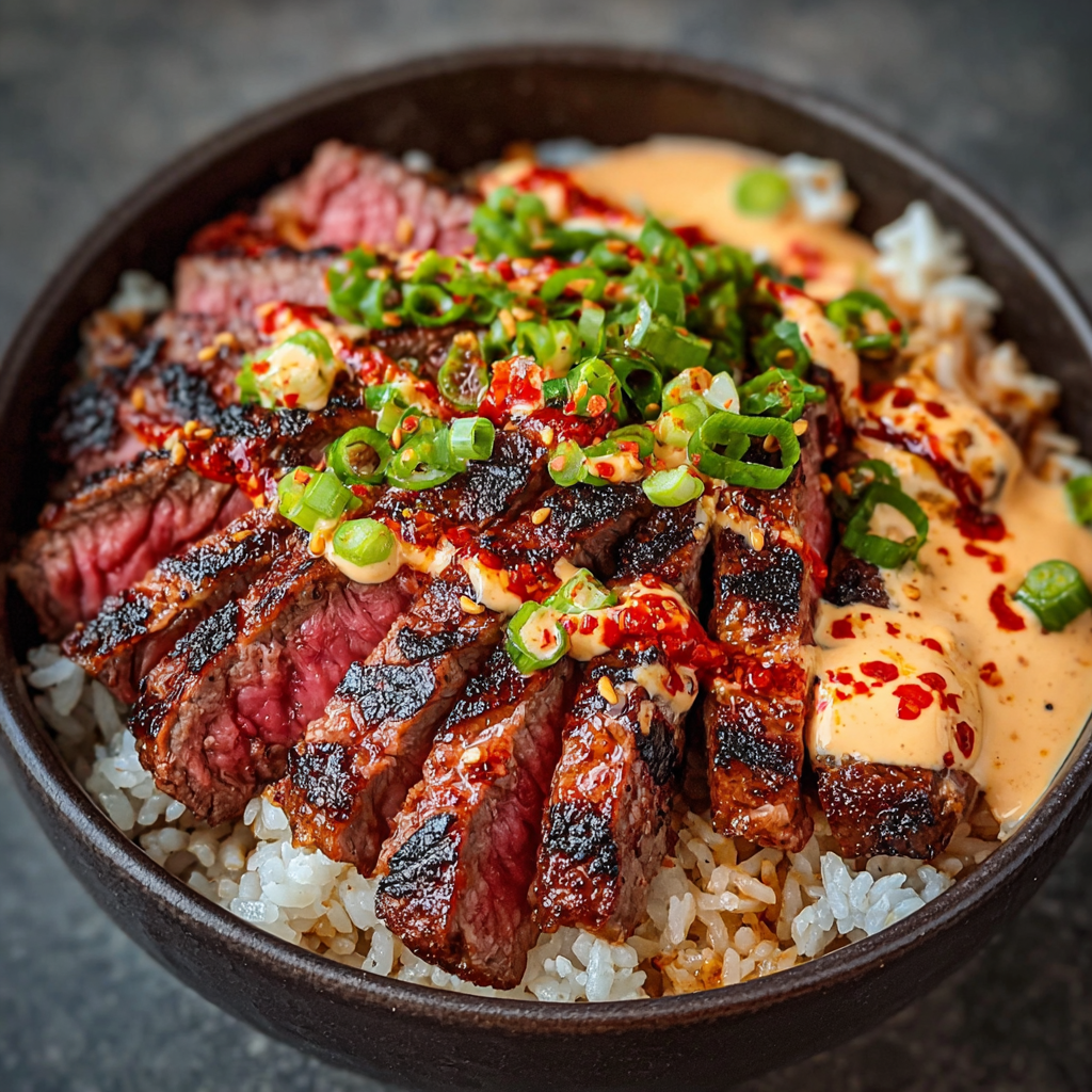 Korean BBQ Steak Rice Bowls with Spicy Creamy Sauce