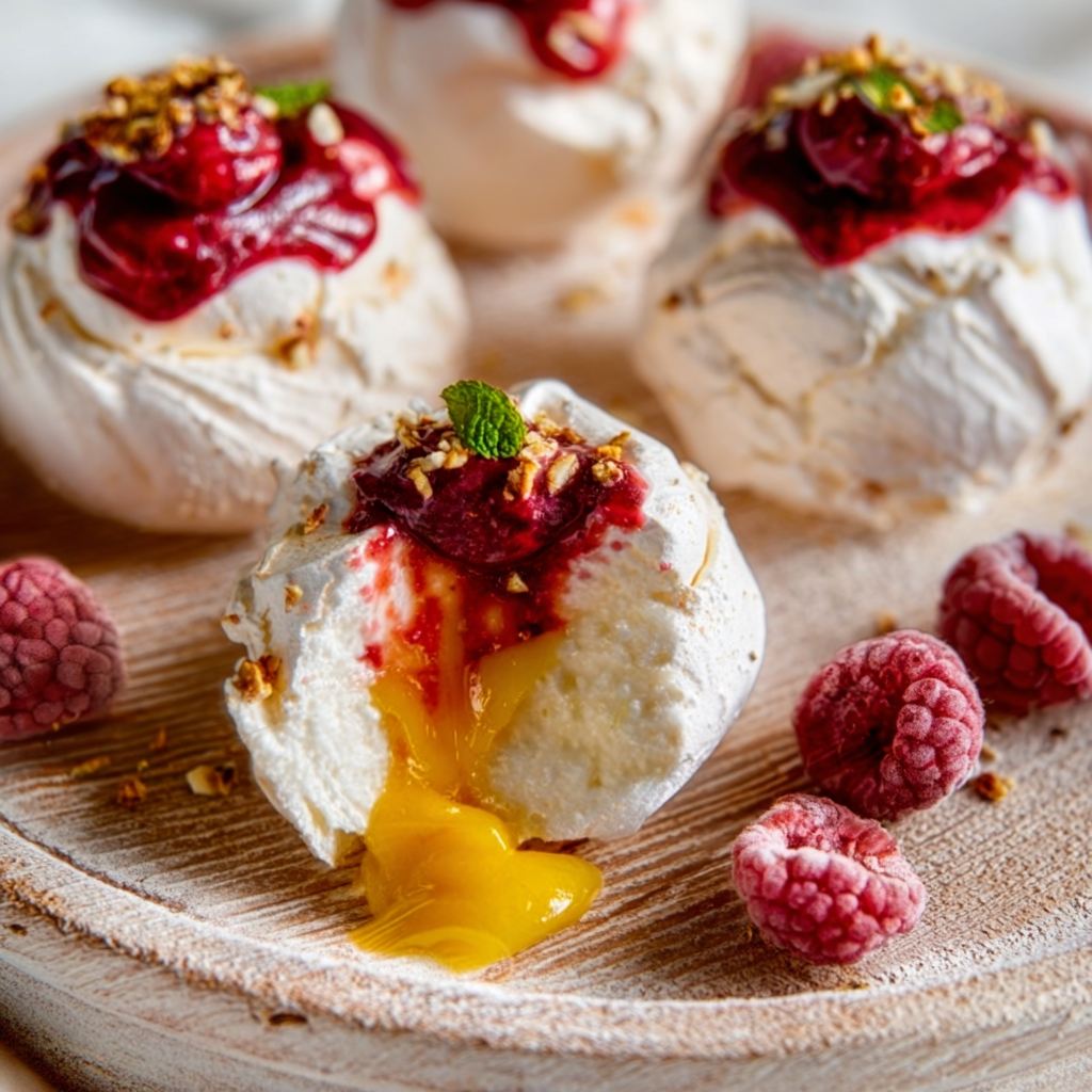 Pavlova Bombs – Mini Pavlovas Filled with Lemon Curd and Raspberry Coulis