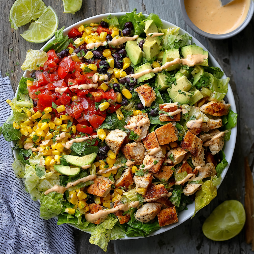 This vibrant salad combines juicy grilled chicken, crisp romaine lettuce, sweet corn, black beans, creamy avocado, and crunchy tortilla strips, all tossed in a smoky chipotle dressing. The result is a hearty, flavor-packed dish that balances fresh vegetables, lean protein, and creamy spice.